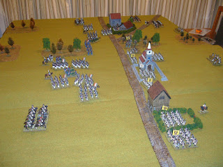 mat-of-war cloth which worked a little better than I thought it would!). There are three separate built up areas along the road that are held by Austrians at the start of the game. To win the French must capture all the wooded areas, and one of these built up areas. Or alternatively either side wins if it demoralises the enemy force.